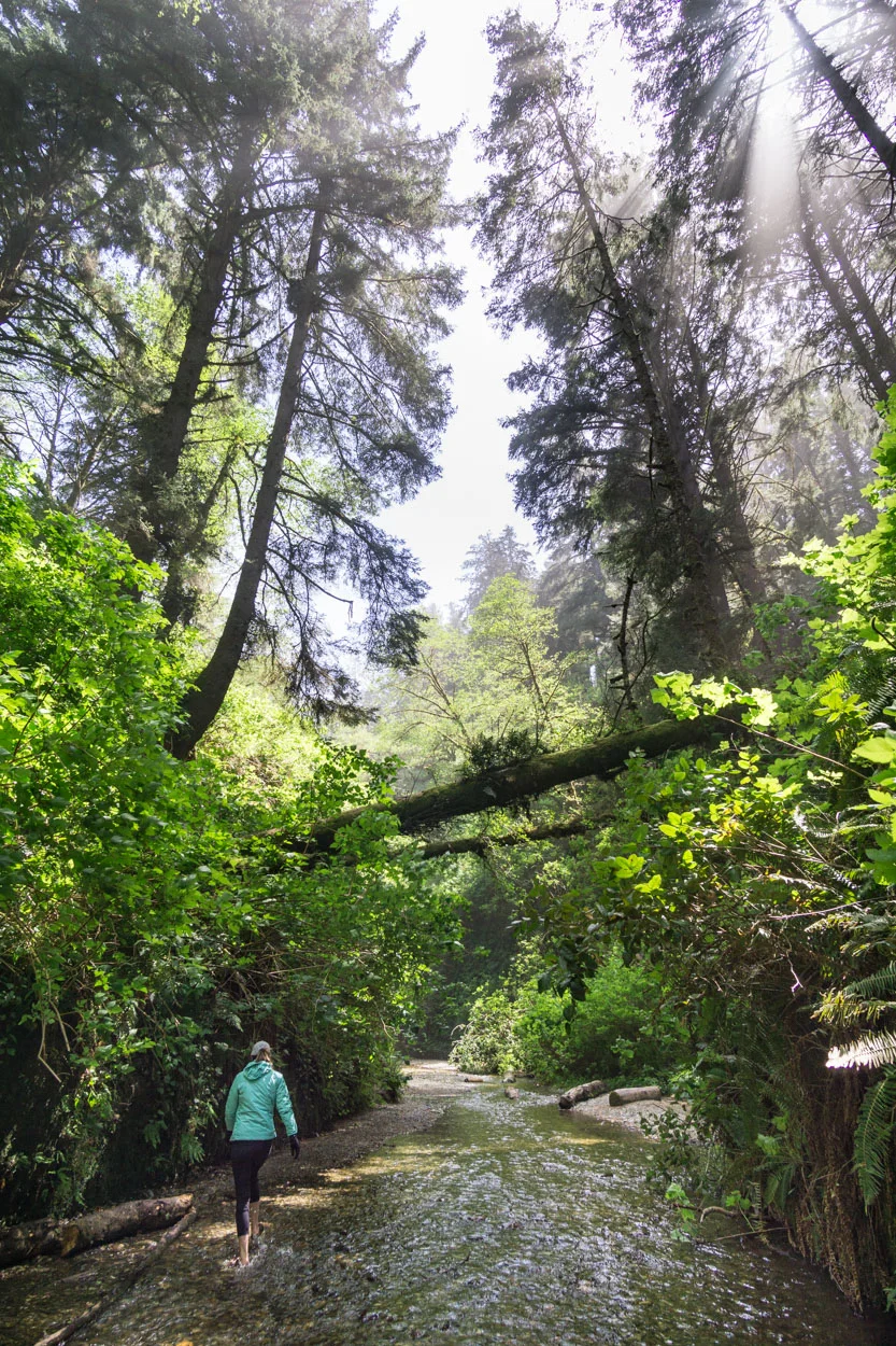 Once you reach the creek, head upstream into the canyon. There are no signs marking the entrance, but just know not to continue heading up the James Irvine Trail, which actually is one of the best redwood hikes in the world.