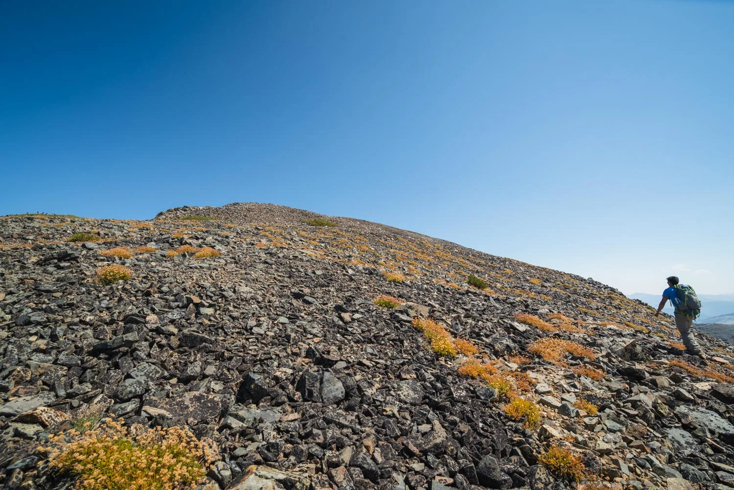 We aimed for a low point on the ridge to the right of the peak, and we found ourselves trying to hike uphill on some pretty rocky shale.