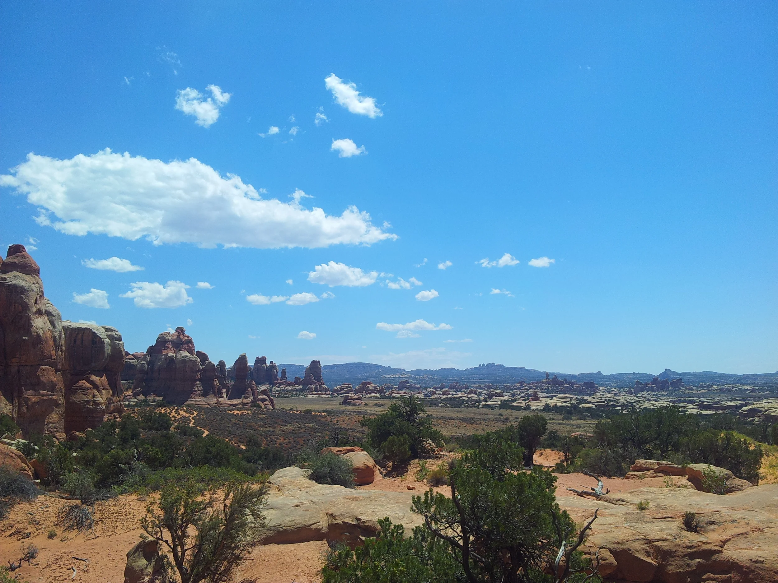 We decided to stop in the shade of the Needles to have a snack, and we encountered 2 other hikers also enjoying relief from the sun. Continuing on, the trail began to climb up and up. After some switchbacks, we emerged on top, overlooking Chesler Park. Since this was quite high up and a valley between the Needles, the wind up here was STRONG.